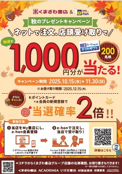開催期間:2025年10月15日~2025年11月30日 【全店】取り寄せ注文(e-hon) 秋のプレゼントキャンペーン 10月15日より、くまざわ書店グループ限定のプレゼントキャンペーンがスタートしました! 期間中のお取り寄せ委注文で図書カードネットギフト1,000円分が抽選で当たります!!! ぜひ、キャンペーン特設ページをチェックしてご参加ください。