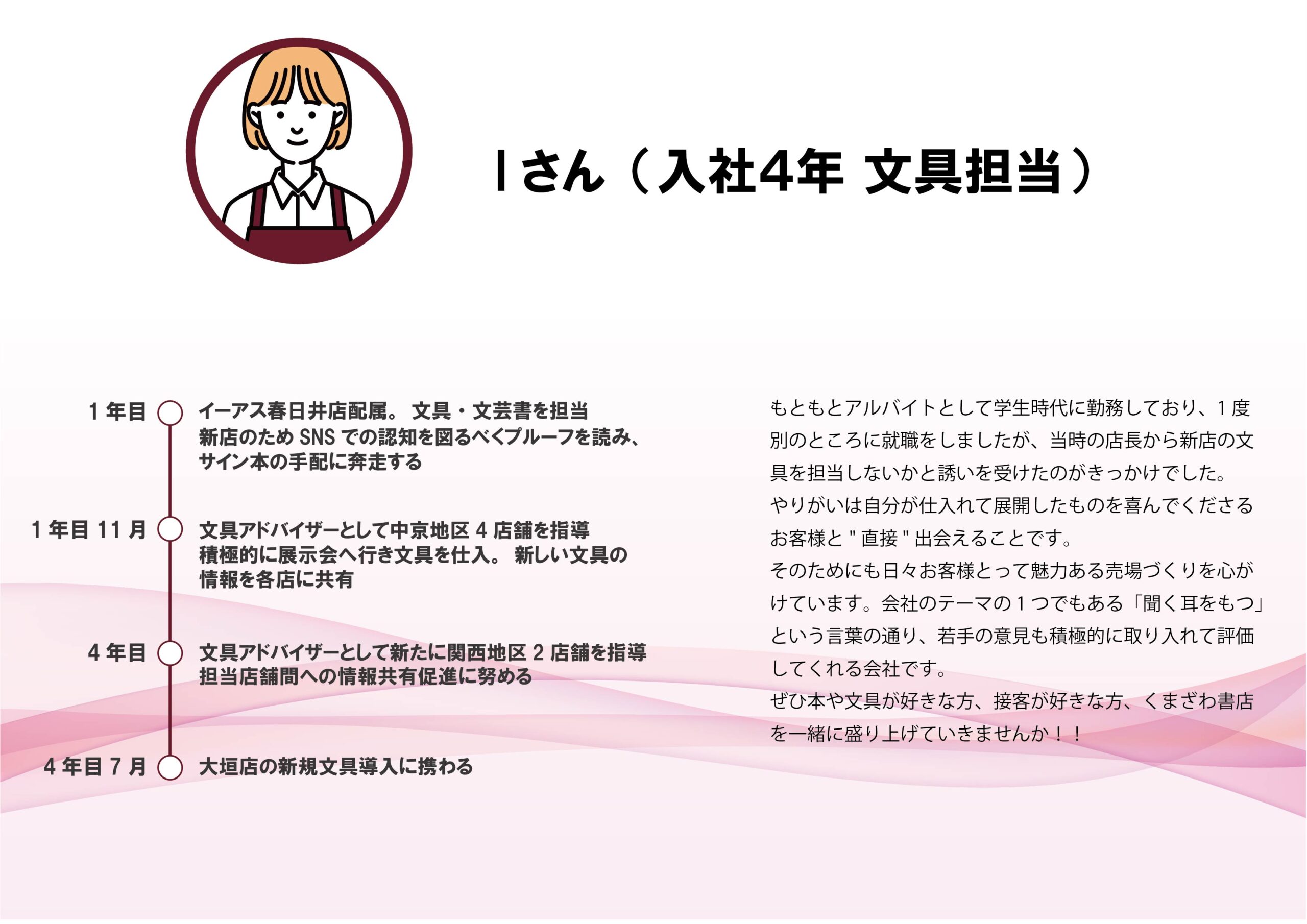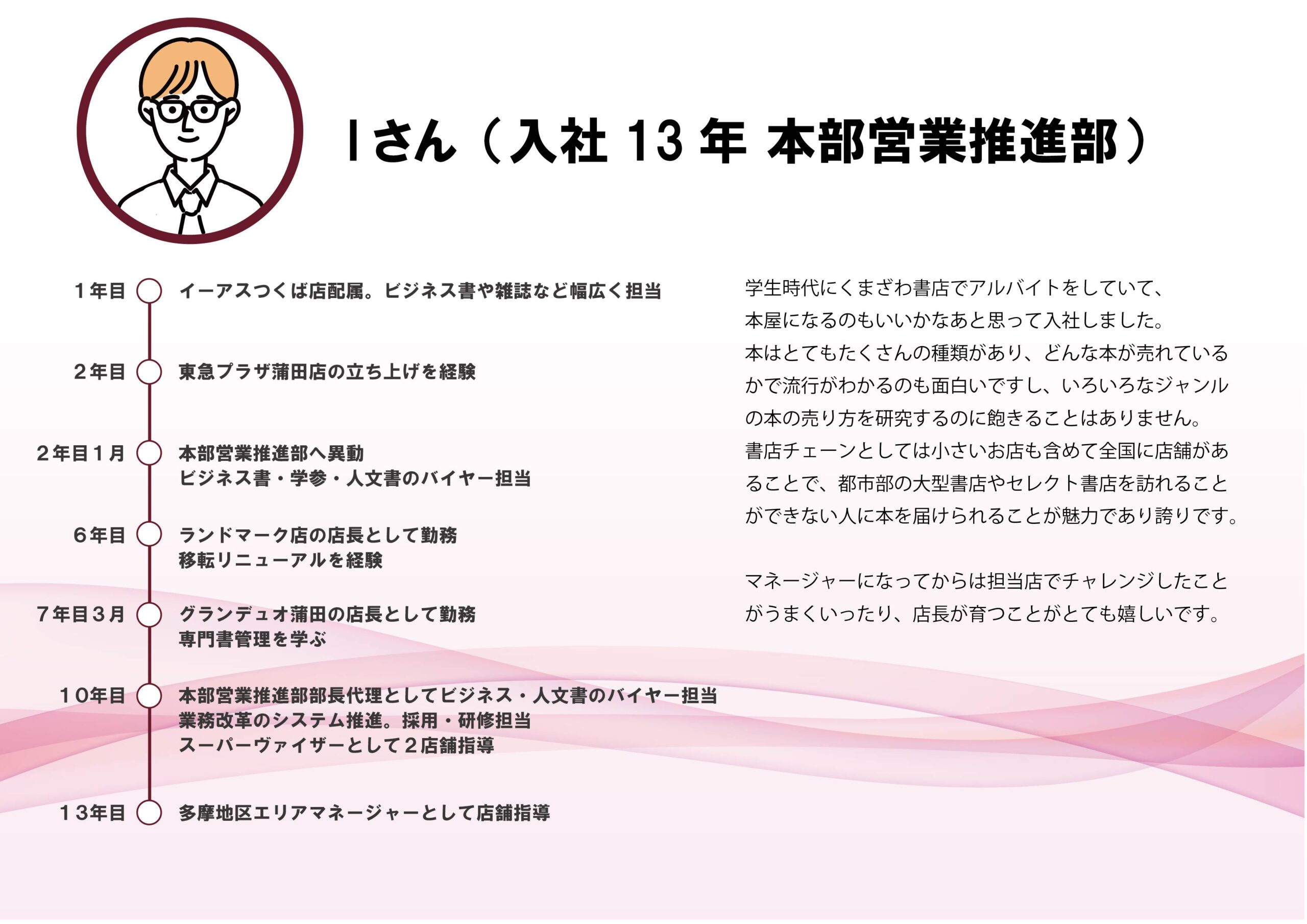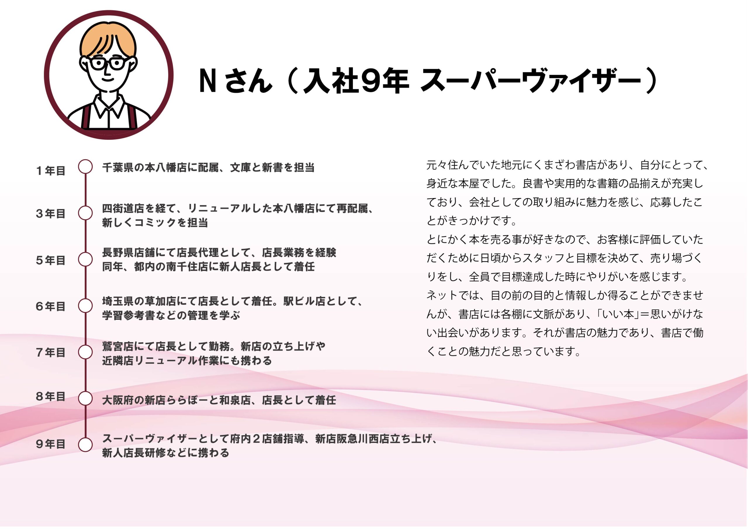 くまざわ書店の先輩社員が入社から現在までどのような仕事をしてきたのか、一部を紹介します。